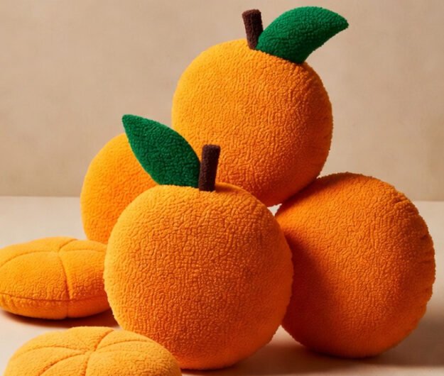 - 6 × Orange-shaped plush pillows variety of sizes from petite segments to full statement oranges,
