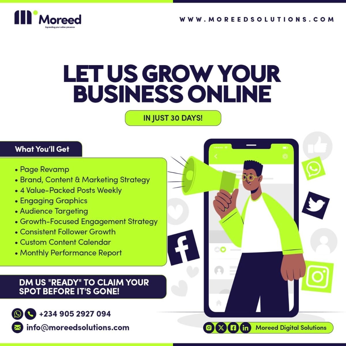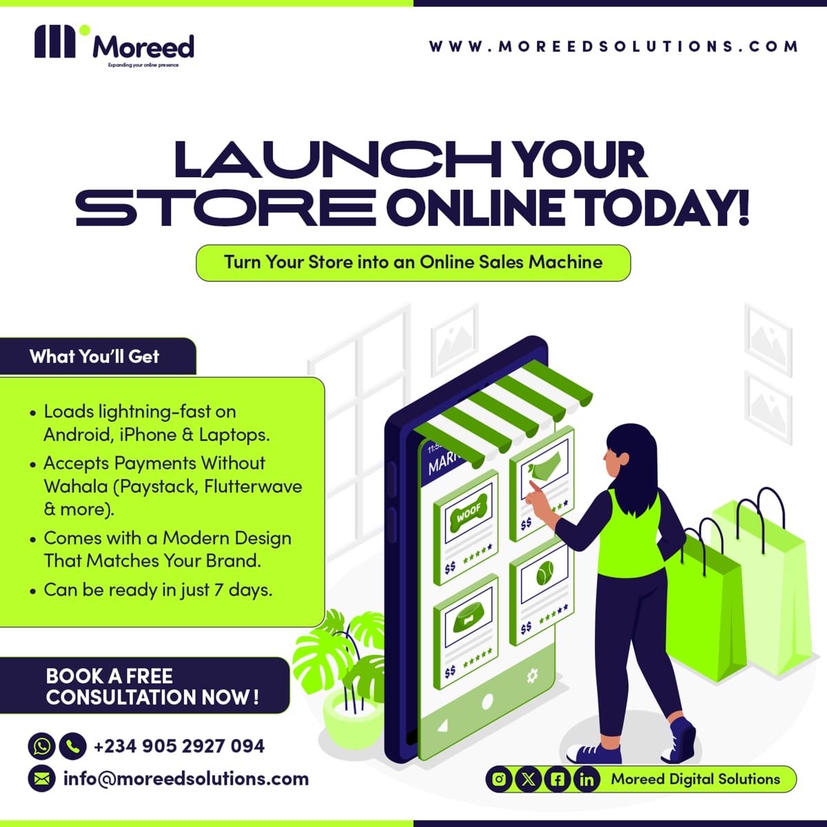 Moreed Digital Solutions is a full-service digital marketing agency in Abuja, Nigeria. We offer website design & development, SEO & content marketing, social media management, brand design, app development, and digital marketing services to help businesses grow online.